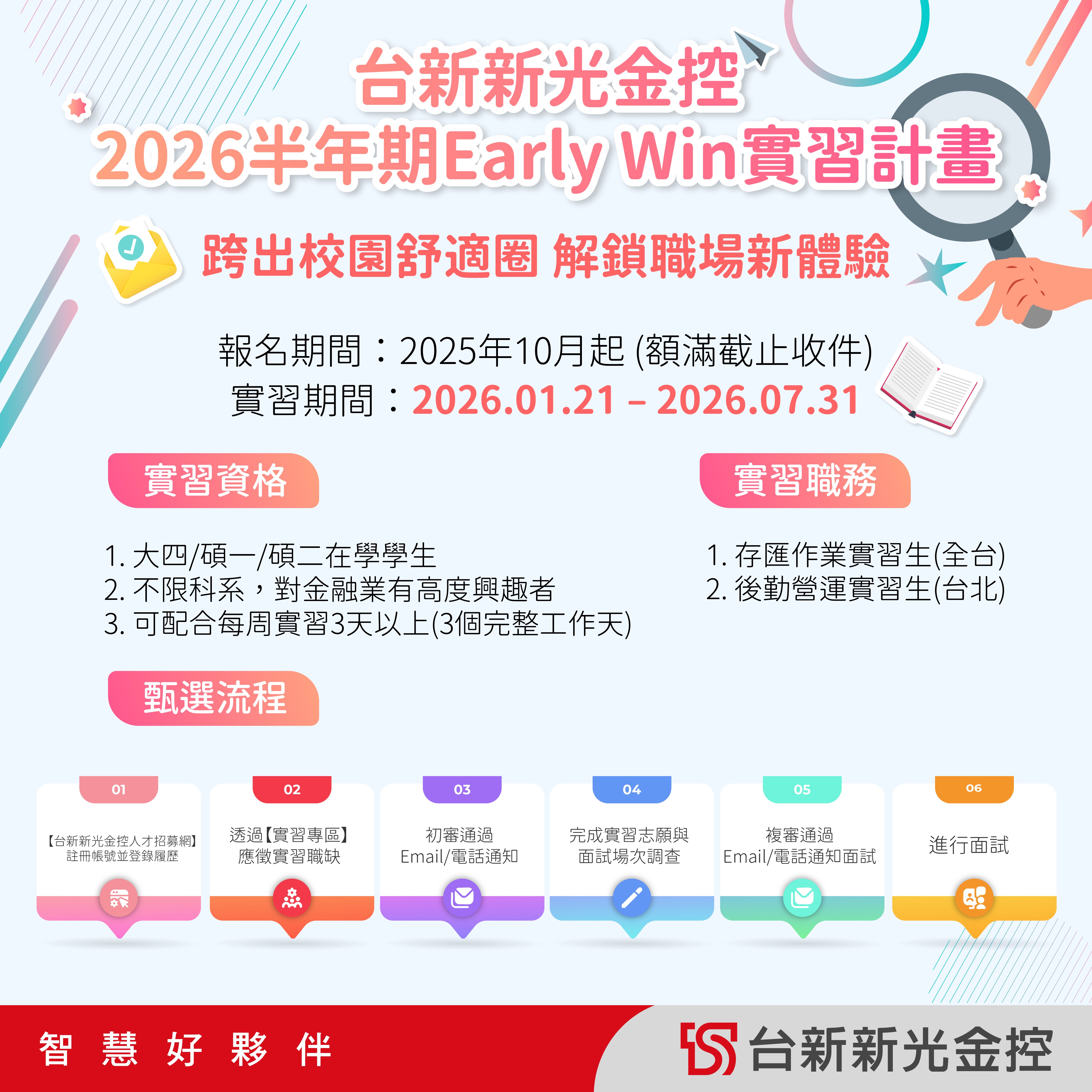 台新新光金控 2026年半年期 的實習計畫開始進行招募囉!相關內容請詳見附件。