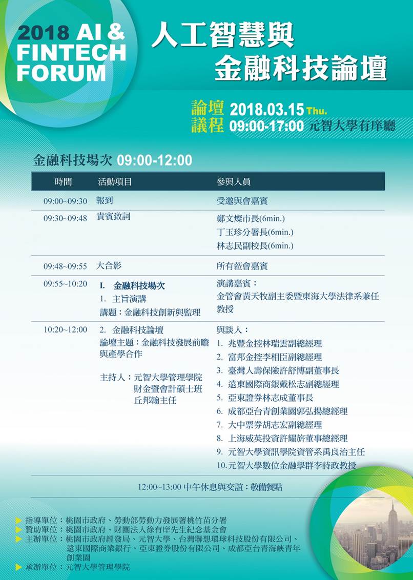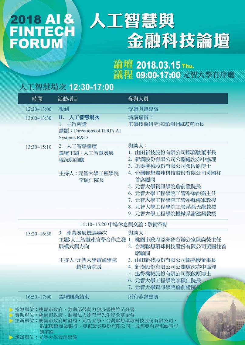 歡迎踴躍報名3/15(四)09:00 人工智慧與金融科技論壇