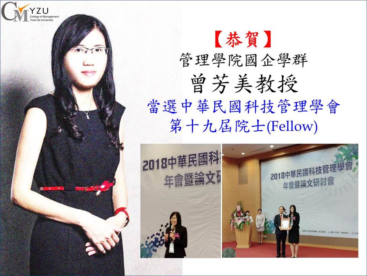 管理學院國企學群 曾芳美教授 當選【中華民國科技管理學會 第十九屆 院士】