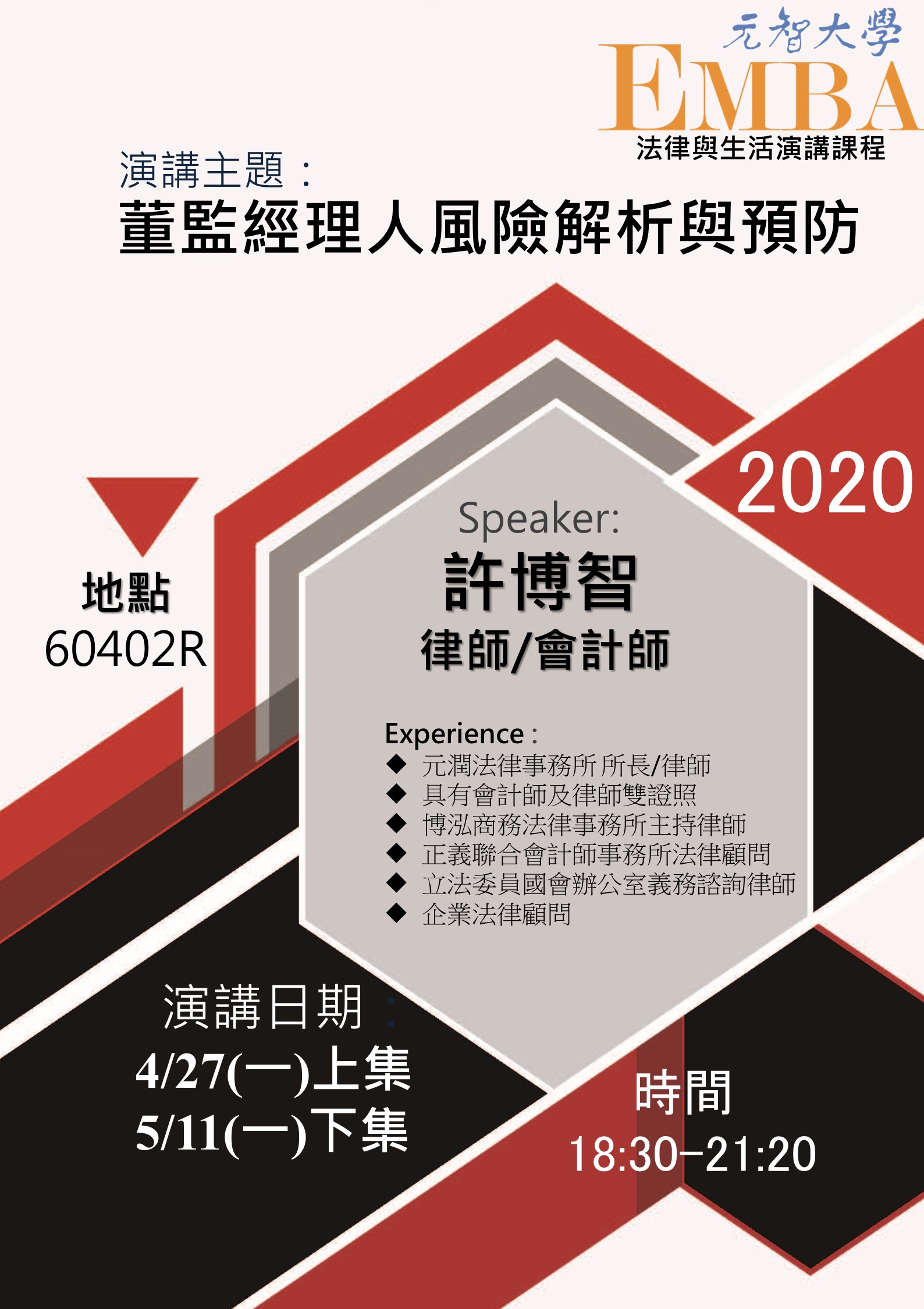 演講時間:4/27(一) 18:30-21:20 演講地點:R60402教室(六館四樓) 演講主題:「董監經理人風險解析與預防」(上集)